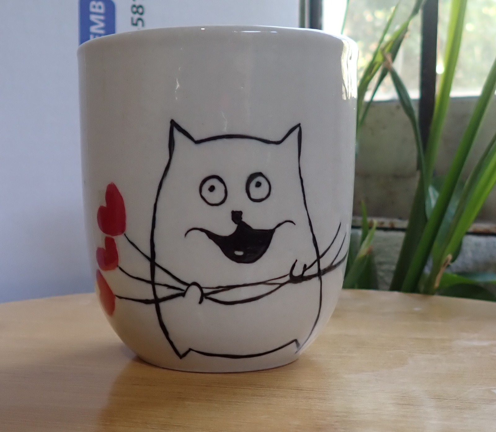 A playful handcrafted ceramic cup featuring a fun cat illustration, perfect for tea or coffee and adding a cheerful touch to your daily routine.