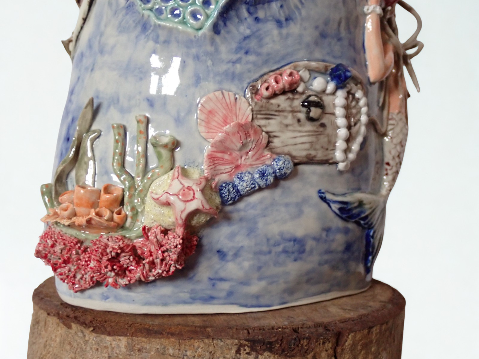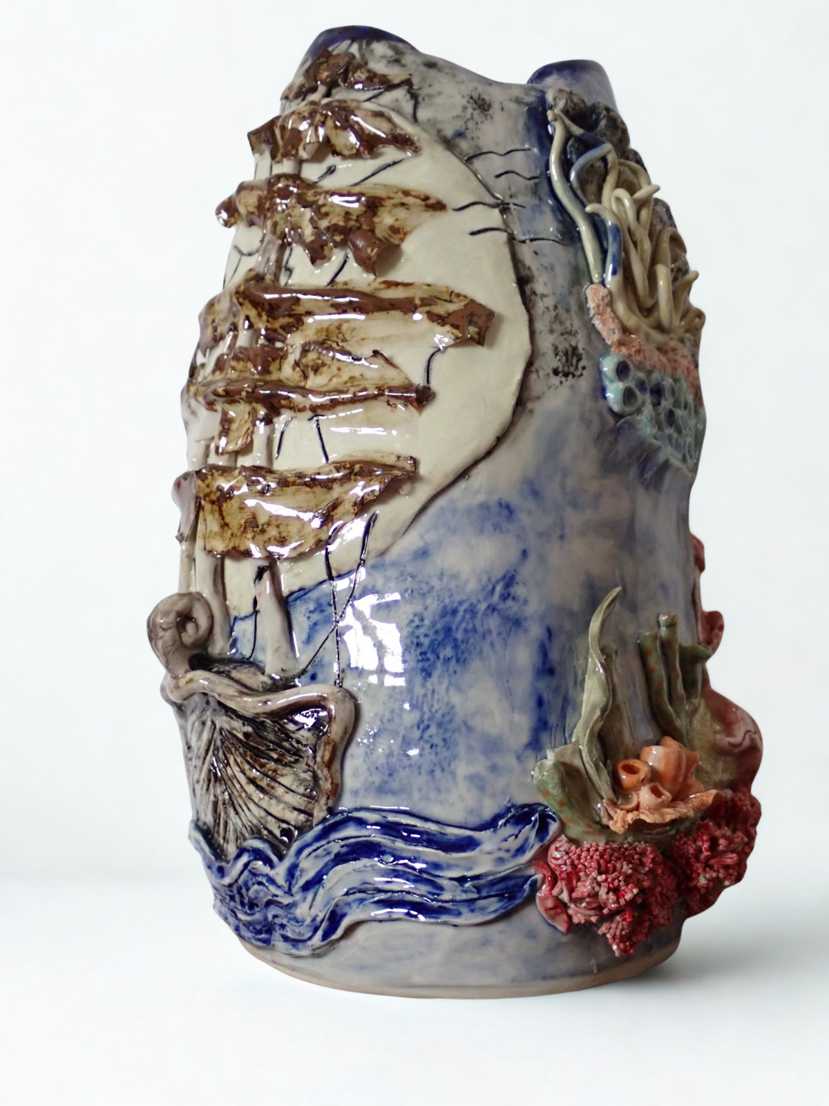 Handmade coil-built vase inspired by the ocean, featuring sculpted corals, shells, and flowing marine textures. Finished in soft blue and white glazes with subtle earthy accents, this piece blends function with sculptural artistry, each angle revealing delicate underwater details.